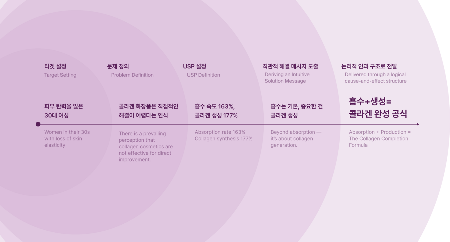 We transformed the main message of “Collagen Absorption + Production” beyond a mere functional distinction into communication language that resonates intuitively with consumers. Through this, we established a strategic communication structure — from the slogan to call-to-action copy — that allows consumers to directly experience the product’s USP (Unique Selling Proposition).