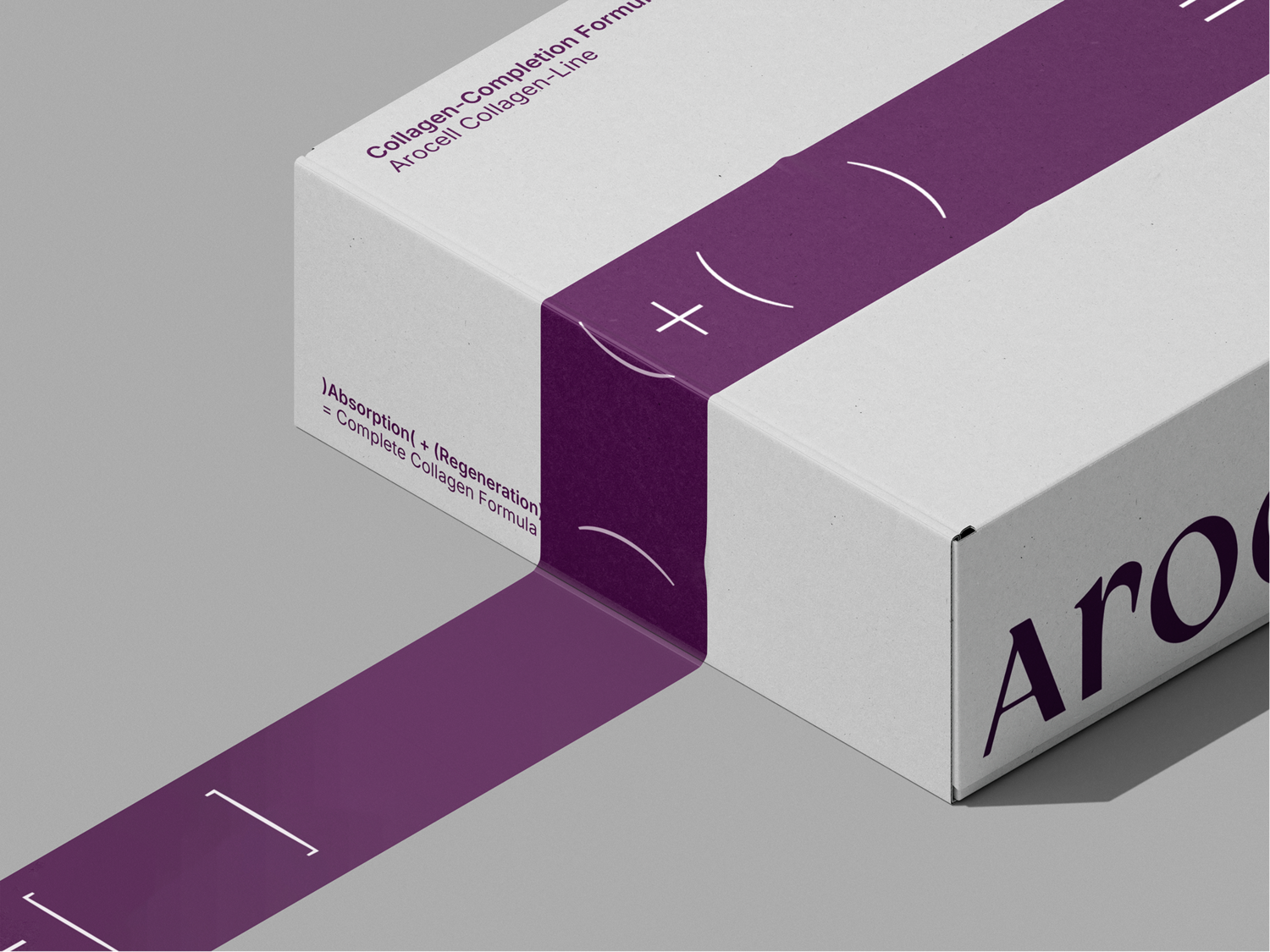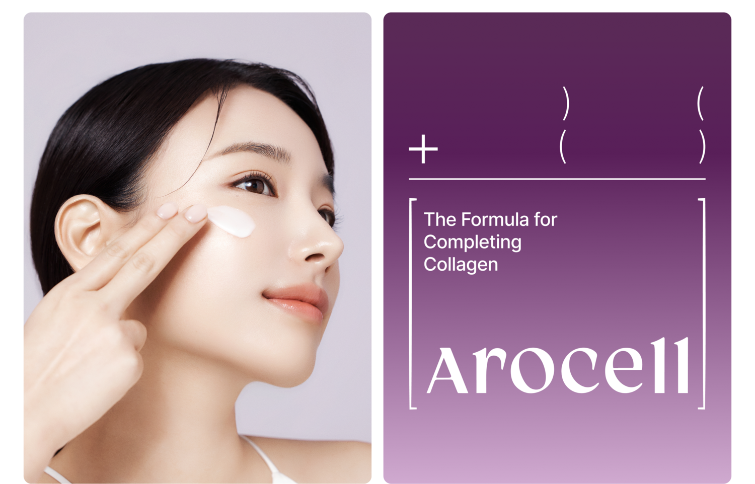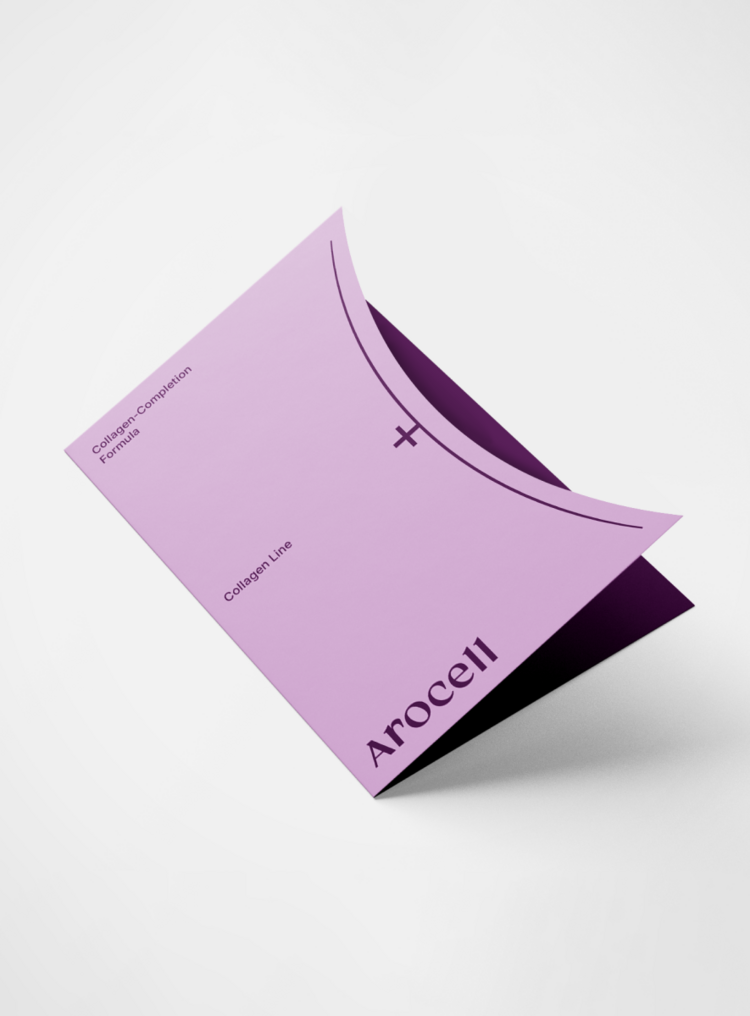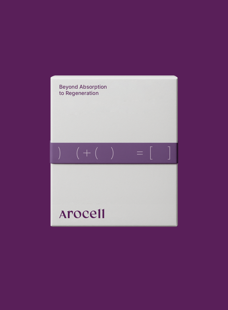 The key visual system of the Arocell Collagen line was inspired by mathematical formulas. To convey the message “Absorption + Production = Collagen Completion” in a clear and intuitive way, parentheses were used as a visual grammar. The absorbing process is represented by contracting parentheses ) (, the producing process by expanding parentheses ( ), and collagen completion by square brackets [ ]. Through this visual metaphor, the step-by-step process of collagen absorption and production is illustrated, clearly expressing the core message and values of the Arocell Collagen line.