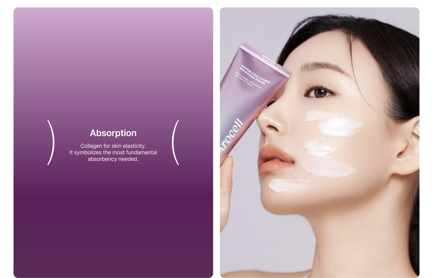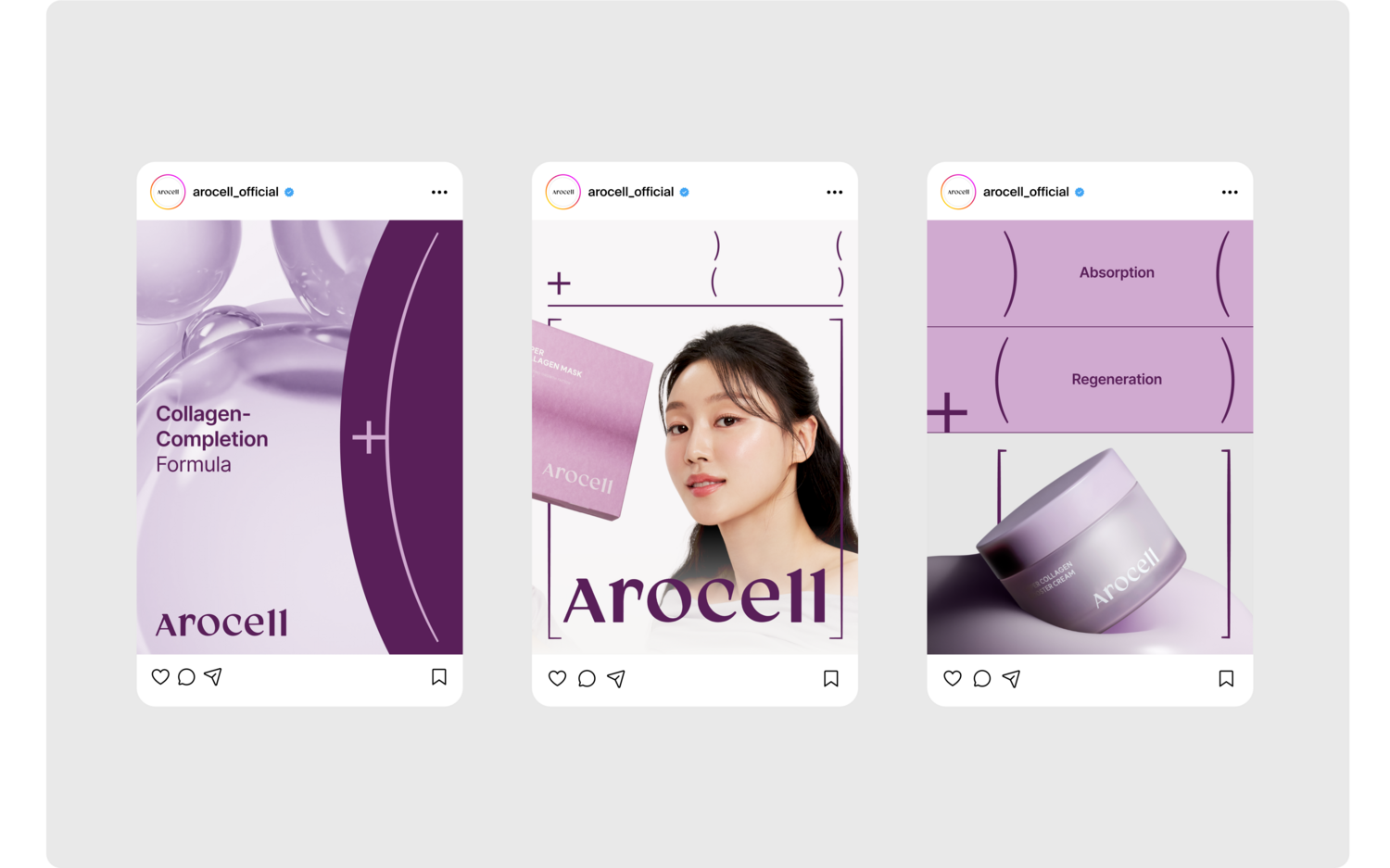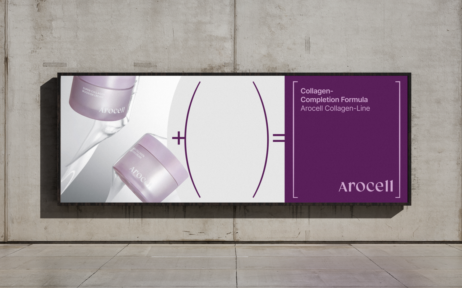 The key visual system of the Arocell Collagen line was inspired by mathematical formulas. To convey the message “Absorption + Production = Collagen Completion” in a clear and intuitive way, parentheses were used as a visual grammar. The absorbing process is represented by contracting parentheses ) (, the producing process by expanding parentheses ( ), and collagen completion by square brackets [ ]. Through this visual metaphor, the step-by-step process of collagen absorption and production is illustrated, clearly expressing the core message and values of the Arocell Collagen line.